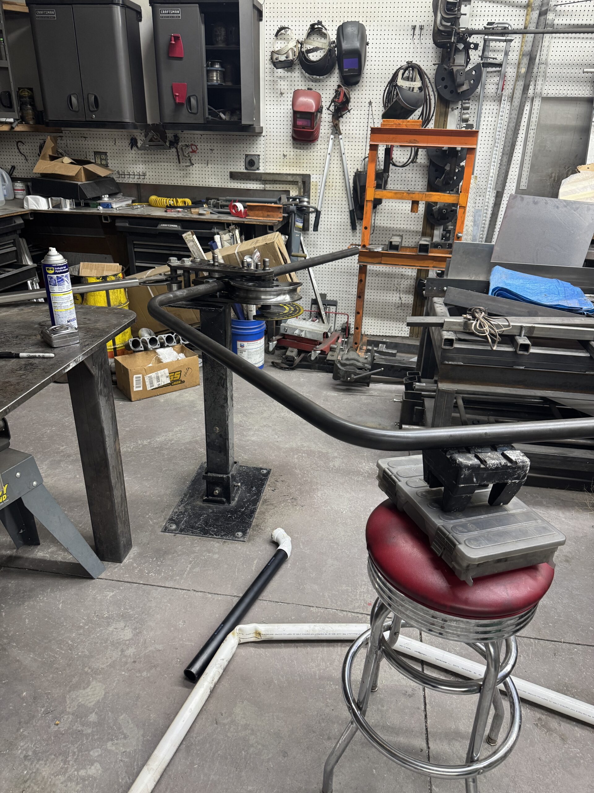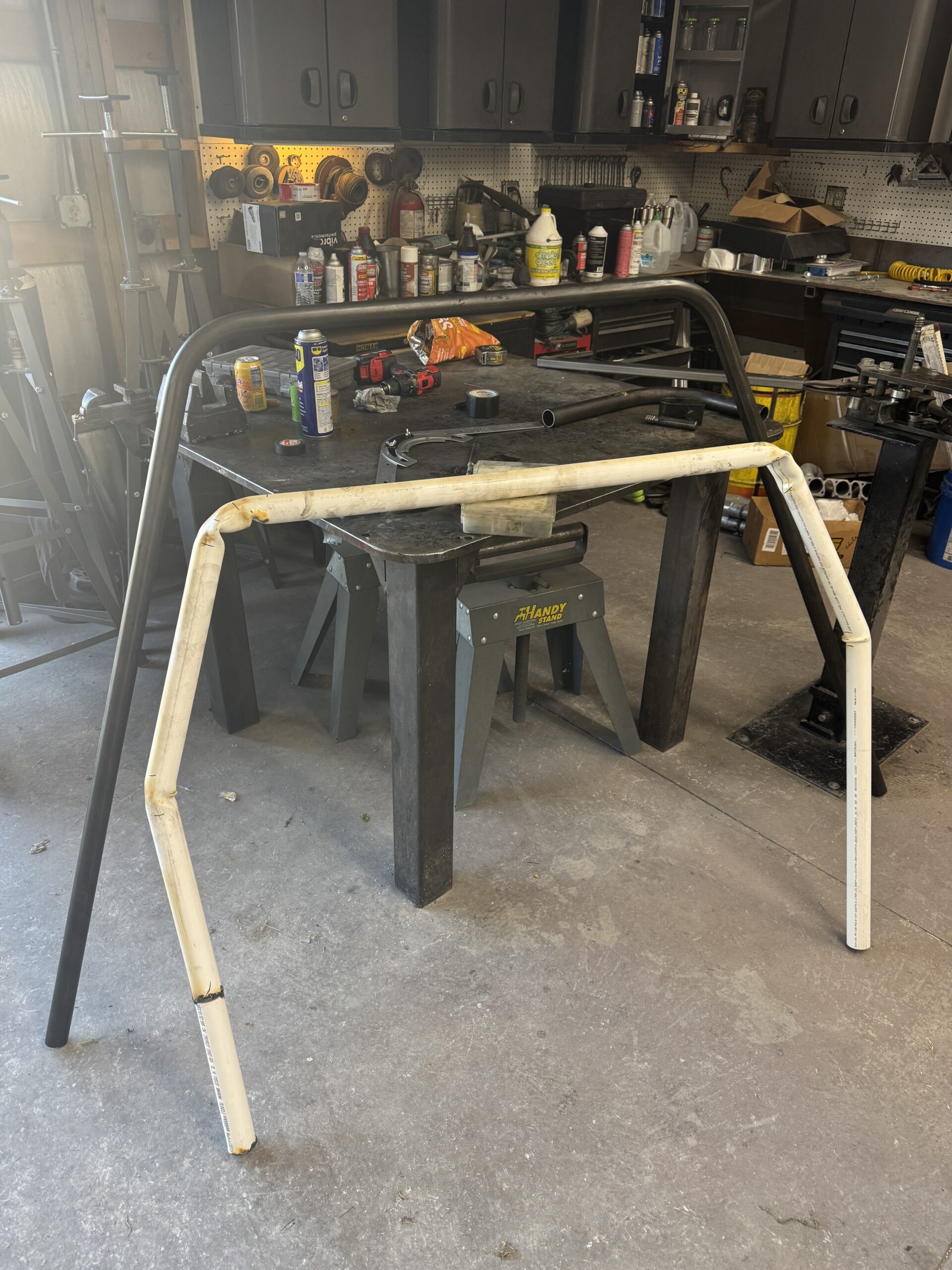 Bars for what I’m attempting will be inch and five-eighths chromoly across the board for strength purposes. With the help of a friend’s tubing bender (Thanks Bill!) I’ve narrowed my cage down to a 8.50 certification, swing-out on driver side and 1 5/8 across the board. Before any bending began, the main hoop construction out of PVC pipe, melting the corners to find my bends and angles was the priority as a template is needed to copy as the bending begins as I tackle the main hoop first.